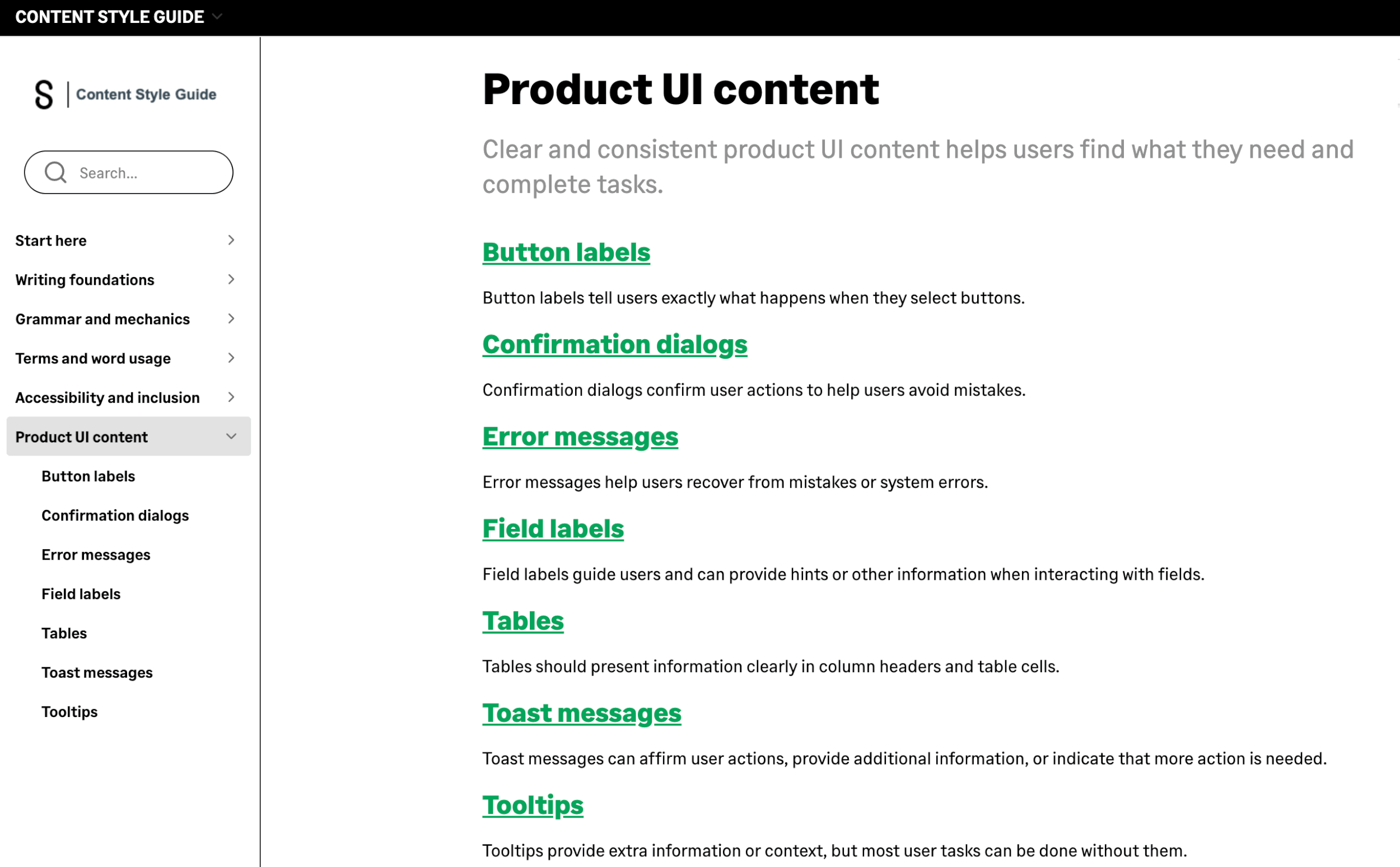 In June, 2025, a new content style guide with a simplified navigation and a new product UI content section was published.